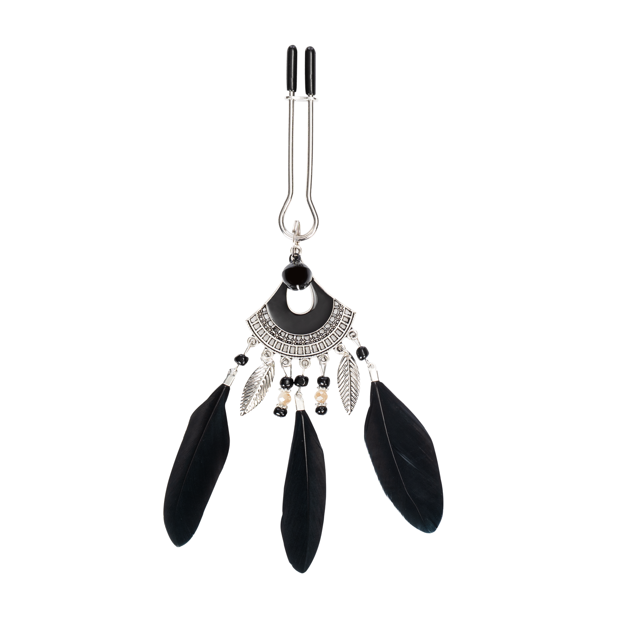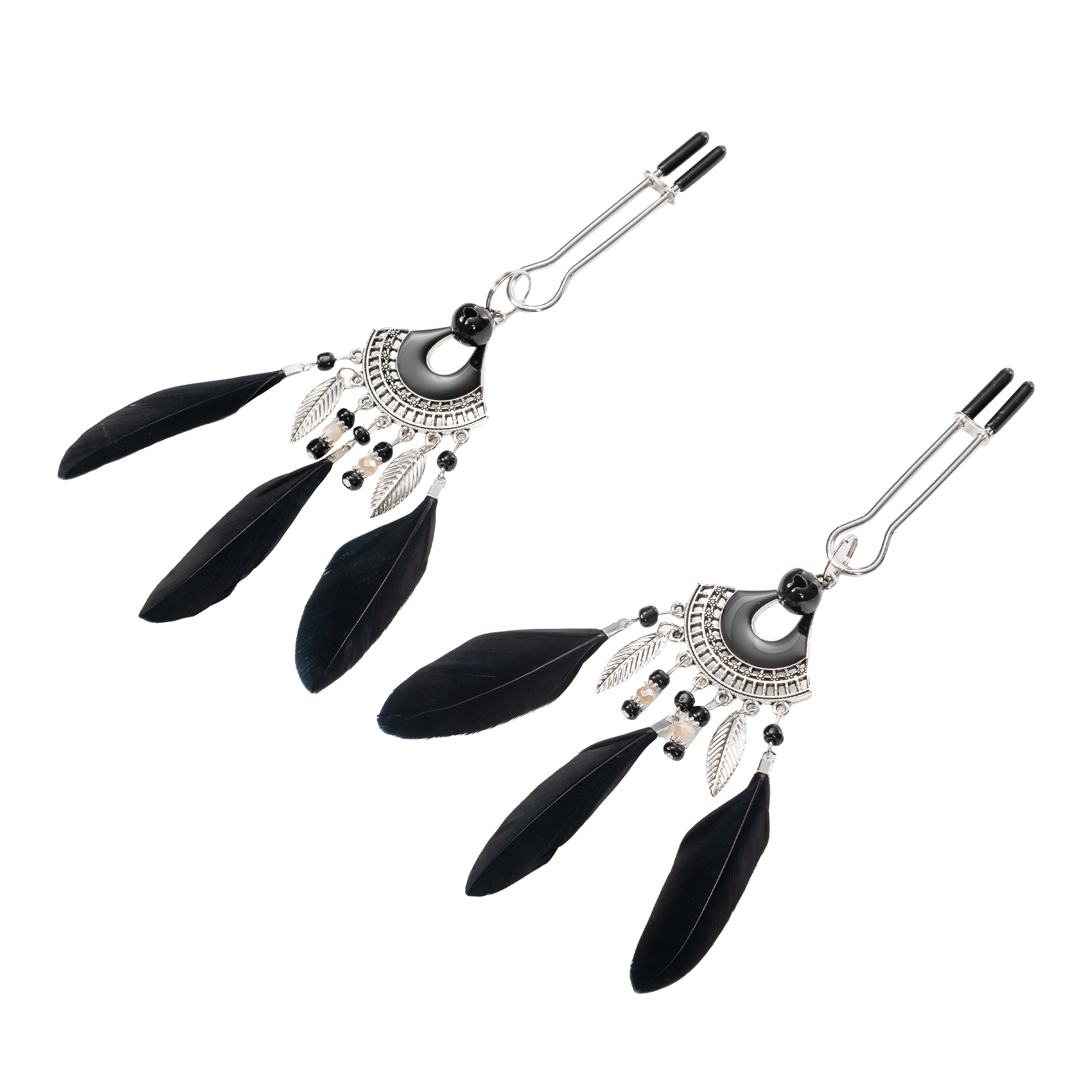 Elke klem is voorzien van een klein zwart belletje en een elegant zilveren juweel met kleine metalen veren, kralen en drie grote zwarte veren, die sierlijk heen en weer wiegen bij elke aanraking voor een speels en sensueel effect.