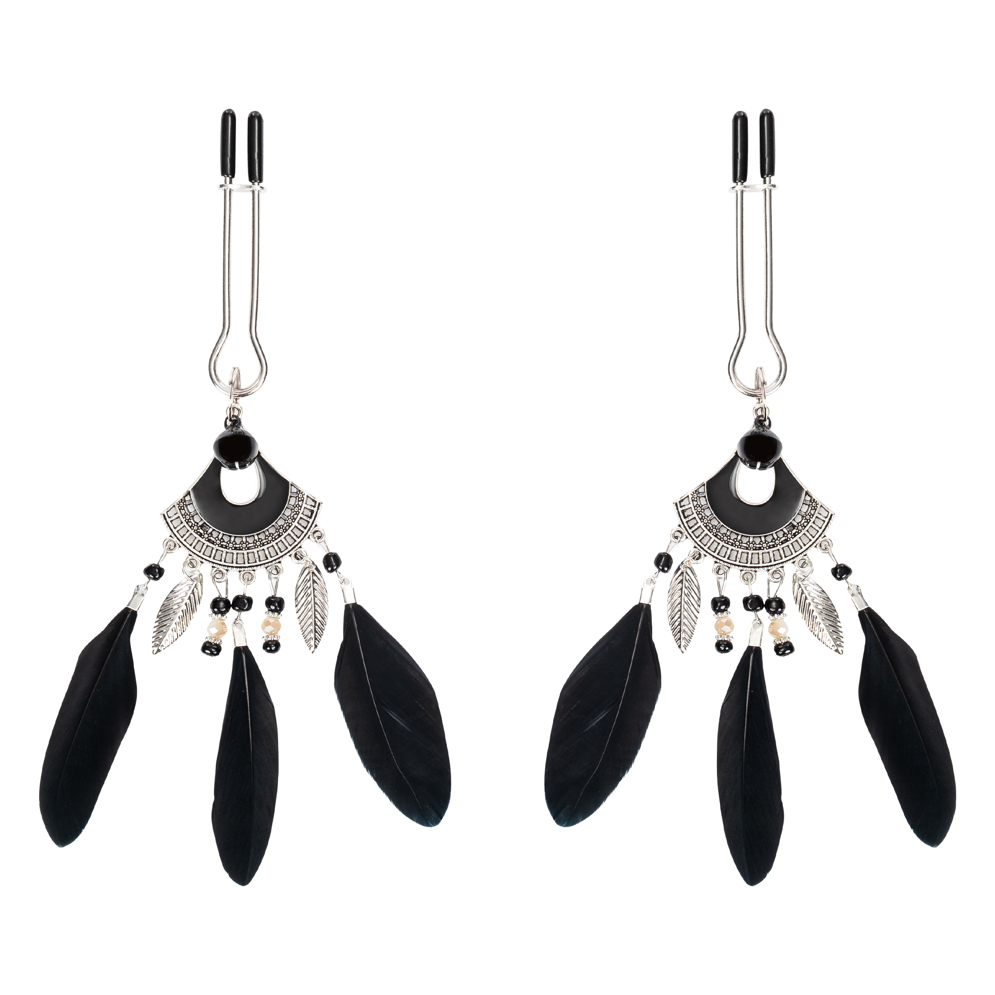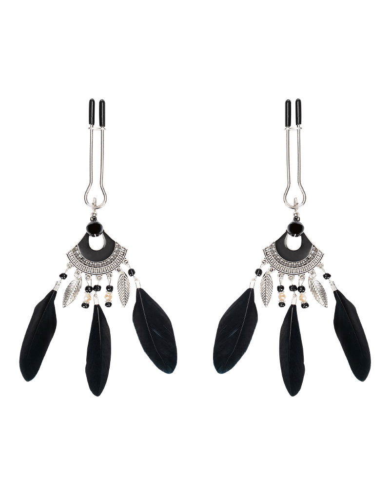 Rimba Bondage Play – Tepelklemmen met veren – Zwart & Zilver