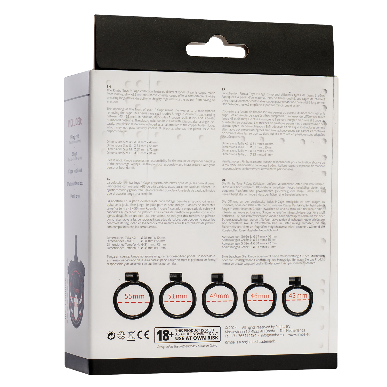 De Rimba P-Cage collectie bestaat uit verschillende soorten peniskooien. Deze kuisheidskooien zijn gemaakt van ABS-materiaal van hoge kwaliteit en bieden een comfortabele pasvorm met een lange duurzaamheid. Een kuisheidskooi weerhoudt de drager van een erectie. Door de opening aan de voorkant van elke P-Cage kan de drager plassen zonder de kooi te verwijderen. Deze peniskooi set bevat 5 ringen in verschillende maten (variërend tussen 43 – 55 mm). Daarnaast bevat het 1 koperen inbouwslot en 3 plastic genummerde hangsloten. De plastic slotjes kunnen na eenmalig gebruik worden afgeknipt met een schaar. Tot slot wordt er een plastic schroef meegeleverd als alternatief voor het koperen ingebouwde slot, dat mogelijk niet door de veiligheidscontroles op luchthavens komt, terwijl het plastic slot luchthavenvriendelijk is.