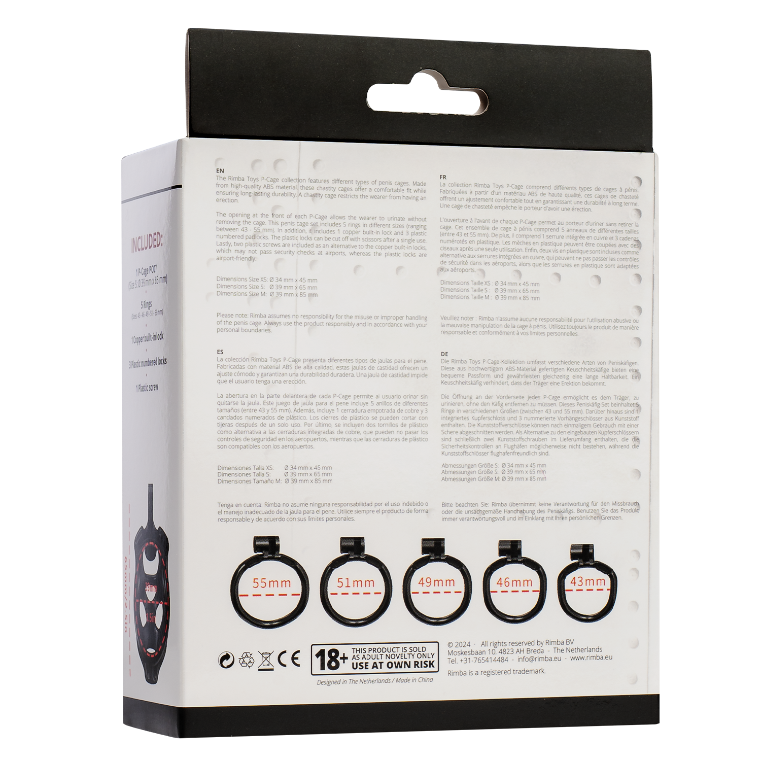 De Rimba P-Cage collectie bestaat uit verschillende soorten peniskooien. Deze kuisheidskooien zijn gemaakt van ABS-materiaal van hoge kwaliteit en bieden een comfortabele pasvorm met een lange levensduur. Een kuisheidskooi weerhoudt de drager van een erectie. Door de opening aan de voorkant van elke P-Cage kan de drager plassen zonder de kooi te verwijderen. Deze peniskooi set bevat 5 ringen in verschillende maten (variërend tussen 43 – 55 mm). Daarnaast bevat het 1 koperen inbouwslot en 3 plastic genummerde hangsloten. De plastic slotjes kunnen na eenmalig gebruik worden afgeknipt met een schaar. Tot slot wordt er een plastic schroef meegeleverd als alternatief voor het koperen ingebouwde slot, dat mogelijk niet door de veiligheidscontroles op luchthavens komt, terwijl het plastic slot luchthavenvriendelijk is.