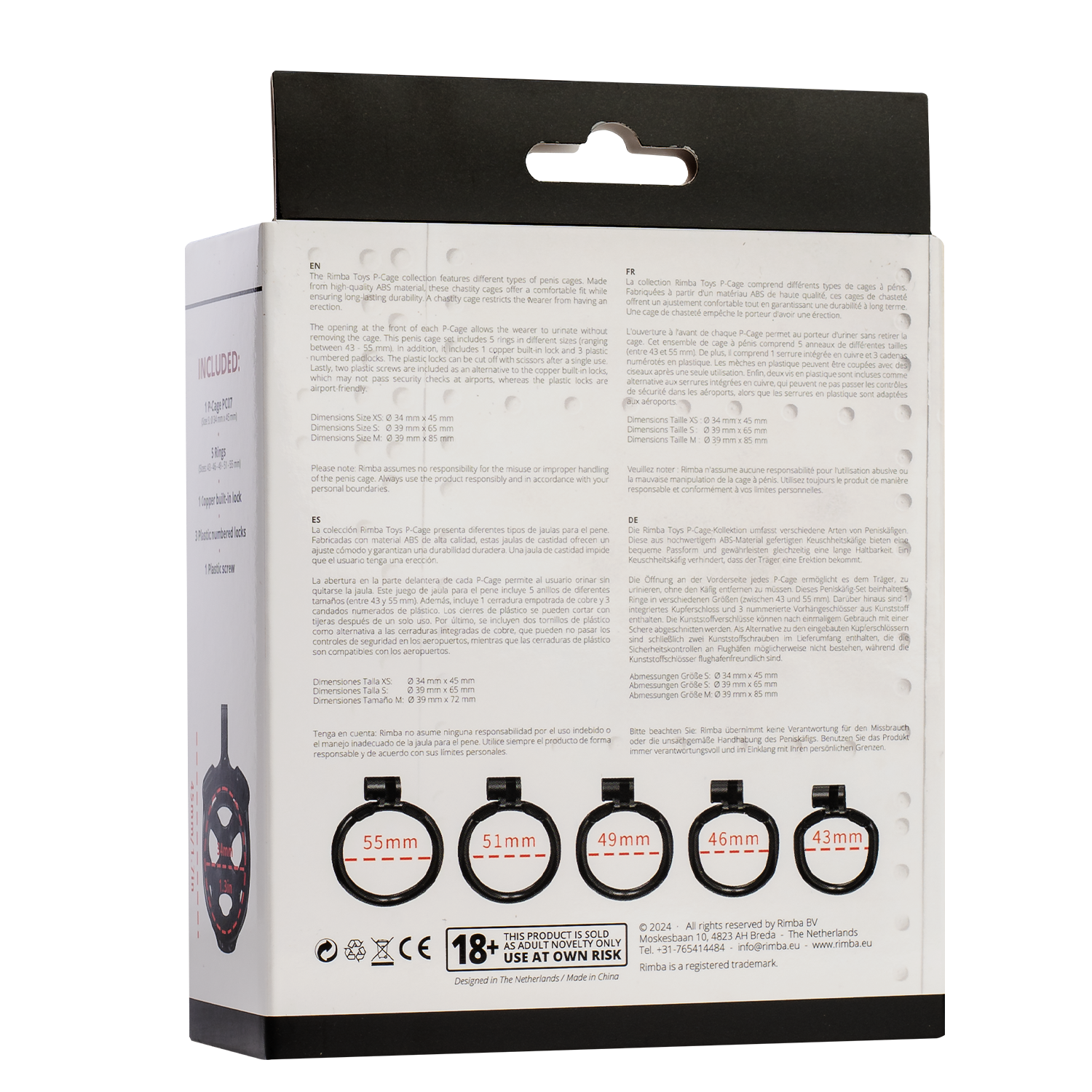 De Rimba P-Cage collectie bestaat uit verschillende soorten peniskooien. Deze kuisheidskooien zijn gemaakt van ABS-materiaal van hoge kwaliteit en bieden een comfortabele pasvorm met een lange levensduur. Een kuisheidskooi weerhoudt de drager van een erectie. Door de opening aan de voorkant van elke P-Cage kan de drager plassen zonder de kooi te verwijderen. Deze peniskooi set bevat 5 ringen in verschillende maten (variërend tussen 43 – 55 mm). Daarnaast bevat het 1 koperen inbouwslot en 3 plastic genummerde hangsloten. De plastic slotjes kunnen na eenmalig gebruik worden afgeknipt met een schaar. Tot slot wordt er een plastic schroef meegeleverd als alternatief voor het koperen ingebouwde slot, dat mogelijk niet door de veiligheidscontroles op luchthavens komt, terwijl het plastic slot luchthavenvriendelijk is.