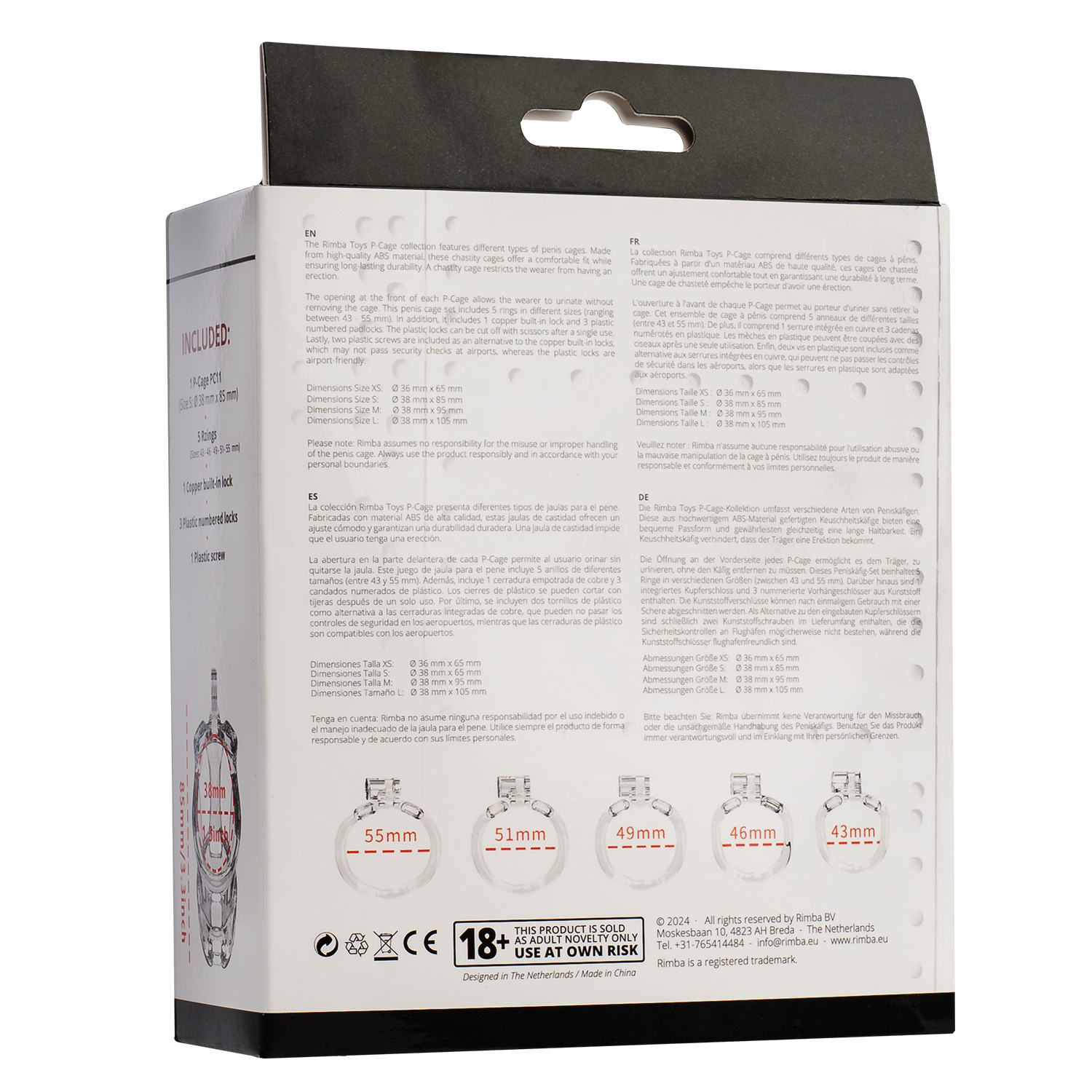 De Rimba P-Cage collectie bestaat uit verschillende soorten peniskooien. Gemaakt van ABS-materiaal van hoge kwaliteit, bieden deze kuisheidskooien een comfortabele pasvorm en een lange duurzaamheid. Een kuisheidskooi weerhoudt de drager van een erectie. Door de opening aan de voorkant van elke P-Cage kan de drager plassen zonder de kooi te verwijderen. Deze peniskooi set bevat 5 ringen in verschillende maten (variërend tussen 43 – 55 mm). Daarnaast bevat het 1 koperen inbouwslot en 3 plastic genummerde hangsloten. De plastic slotjes kunnen na eenmalig gebruik worden afgeknipt met een schaar. Tot slot wordt er één plastic schroef meegeleverd als alternatief voor de koperen inbouwsloten, die mogelijk niet door de veiligheidscontroles op luchthavens komen, terwijl het plastic slot luchthavenvriendelijk is.